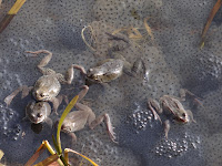 Moving along the bank, I saw more and more frogs sunning themselves and occasionally popping up or down. Eventually, I came to a single huge conglomeration of frogspawn, clearly of different maturities since the "black dots" were of different size. There were more frogs amongst the spawn than anywhere else. And while I was watching, one jumped on top of another. I'm not sure it was a happy pairing since the jumped upon flailed its legs violently . But all that did was to encourage more frogs to leap on the pair. I felt obliged to leave them to their business. That day, apart from Frog City, I saw nothing else moving in the canal.